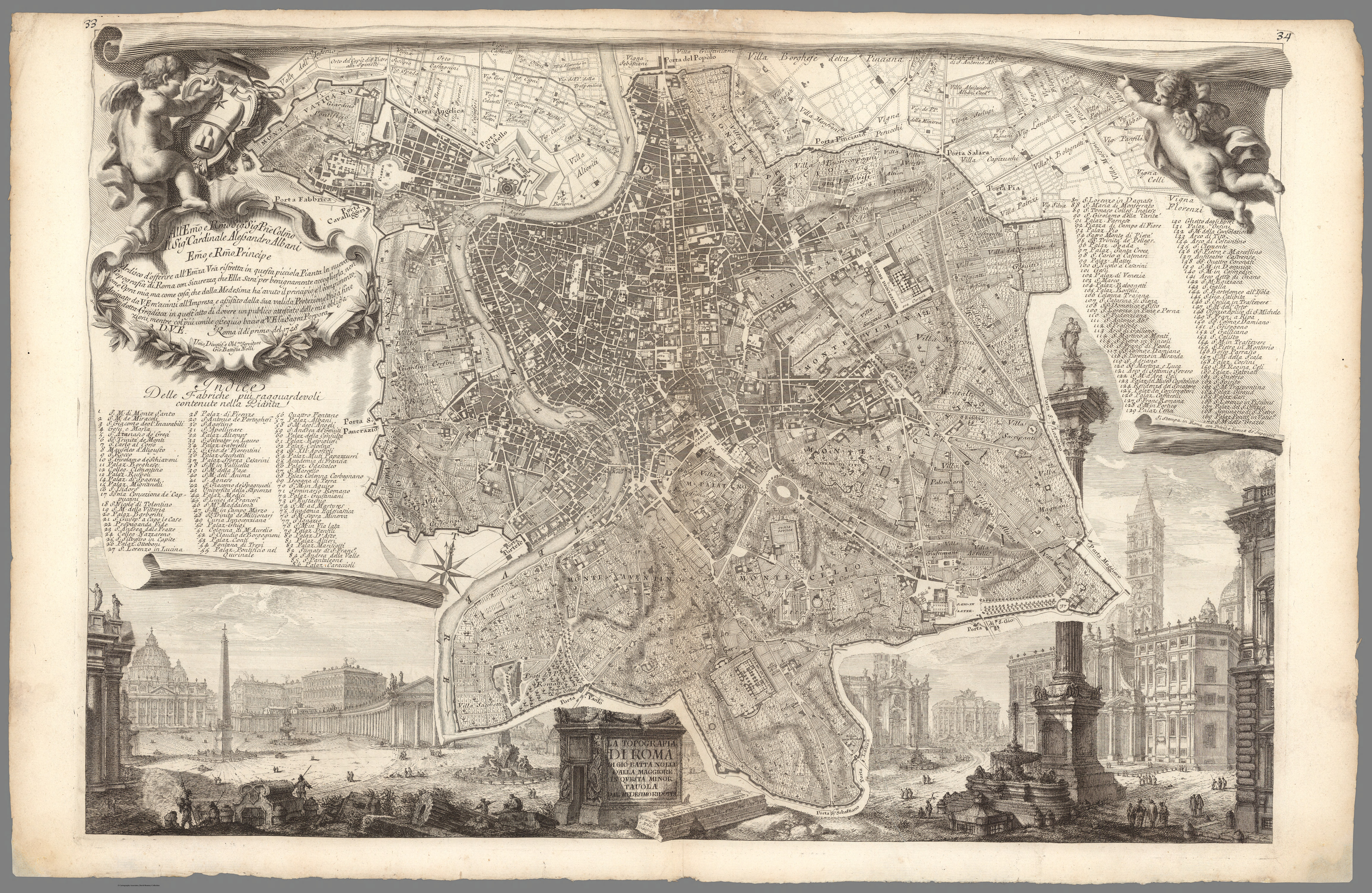 In 1736, together with his son Carlo Nolli, he started working on a modern and detailed map of Rome (Rome maps of the time used to be oriented to the east and often showed the city in axonometric view). Initially they self-financed the work but were able to attract the interest of the cardinal Prospero Lambertini who in 1740 succeeded Clement XII and became the 247th Pope under the name Benedict XIV. Lambertini commissioned them to finalize the map and provided wide-ranging authorization which allowed the group to conduct their surveys also in private properties such as monasteries, gardens and vineyards. They gathered a larger group of professionals, one of them the young Venetian Giambattista Piranesi who joined the group in 1740. Nolli published his map in 1748 with a dedication to the commissioner, Pope Benedict XIV.